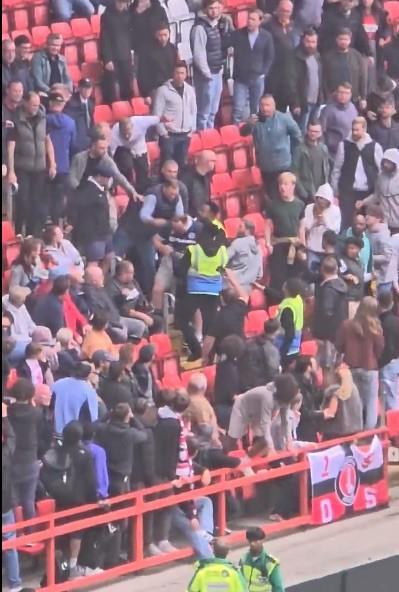 从视频中可以看出,我不知道是喝多了酒后的无意识行为还是故意行为。这位球迷不仅穿着米尔沃尔球衣坐在查尔顿的主场看台上,还在比赛结束时庆祝米尔沃尔的扳平进球,甚至亲吻队徽挑衅,这引起了周围主队球迷的强烈不满。有些人试图冲过去,有些人甚至在他转身时从后面踢。然后他被推下楼梯,杂物在这个过程中被砸碎了。