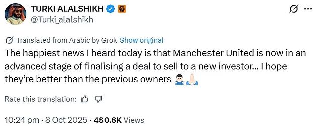 沙特娱乐局局长图尔基·谢赫周四在社交媒体上暗示,曼联已经准备好向新投资者出售俱乐部。