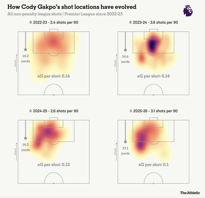 这些数据也证实了肉眼所见。加克波下降的一个关键原因是射门选择。下面的射门分布图显示,他更多地选择在禁区左边和远处进行冒险射门,而不是进入更具威胁性的中路区域。
