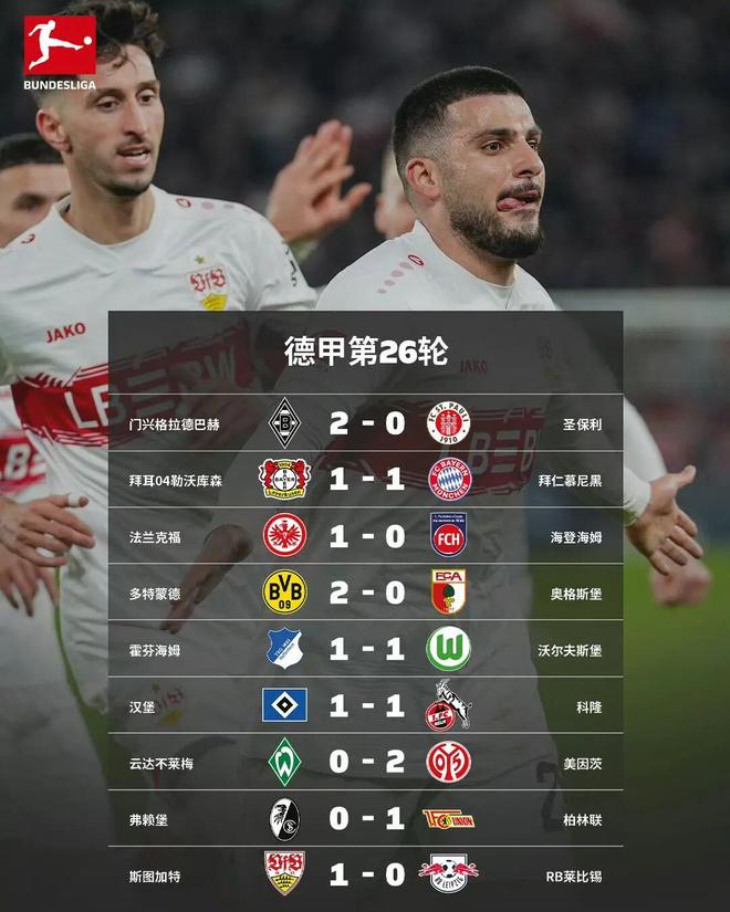 在北京时间3月16日凌晨举行的关键冠军杯比赛中,斯图加特1-0击败克莱比锡,德甲第26轮全部比赛结束。拜仁慕尼黑被罚下2人,客场1-1艰难击败勒沃库森;多特蒙德以2-0击退前来拜访的奥格斯堡,将与拜仁的差距缩小至9分;霍芬海姆在与沃尔夫斯堡战平后得分50分,而斯图加特在获胜后得分也达到50分,因为净胜球的劣势而排名第四;RB莱比锡以47分排名第五,勒沃库森以45分排名第五。不幸的是,这一轮错过了超越莱比锡的机会。